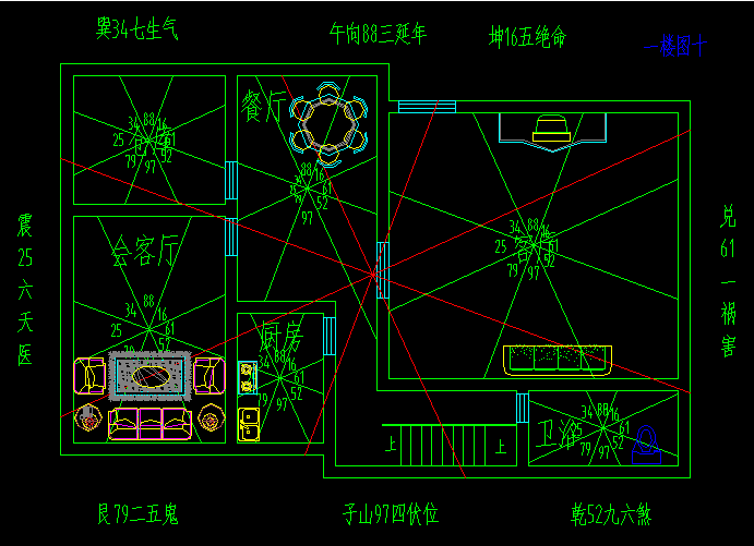 巽宅(坐东南向西北),财位在客厅西南方、东南方。