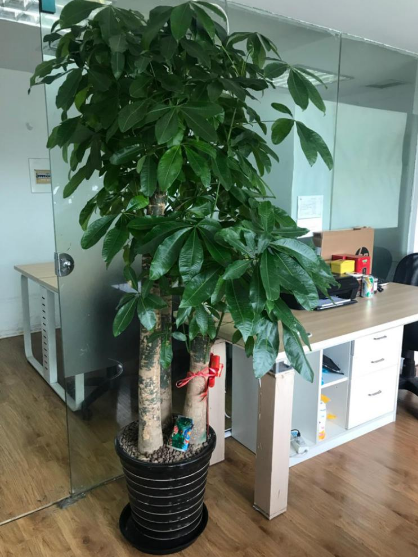 1、植物发财树,其株形美观,根茎部肥大,茎叶周年翠绿,且枝条柔软,可编织造形,老枝截干可迅速萌发枝叶,普遍摆放于商店、厂家开业和家居装饰。