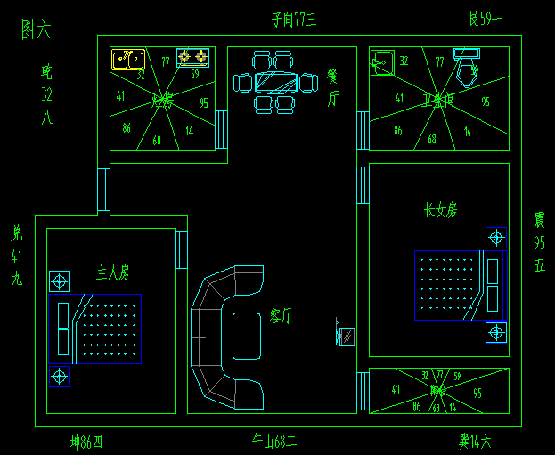 六煞方──文曲,中凶。这个方位常常在一个人的心理上造成负担,容易心情抑郁不开朗,凡事想不开,而失去了乐观向上的心,然后因为什么事情都作不好、容易犯错,而想逃避现实。它将对人的影响有:烦脑、失眠、纠纷多、判断力薄弱等。