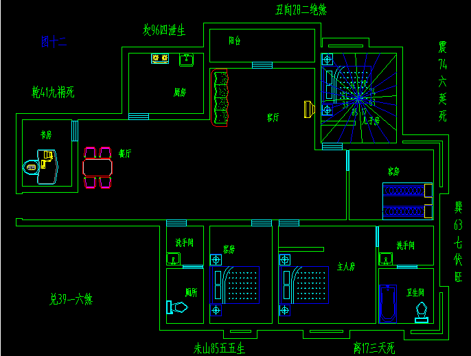 化解方法:只能用无根水和六帝钱化解。如果可以的话,在楼上卫生间内各摆放一个八卦凹镜,面向上也可。