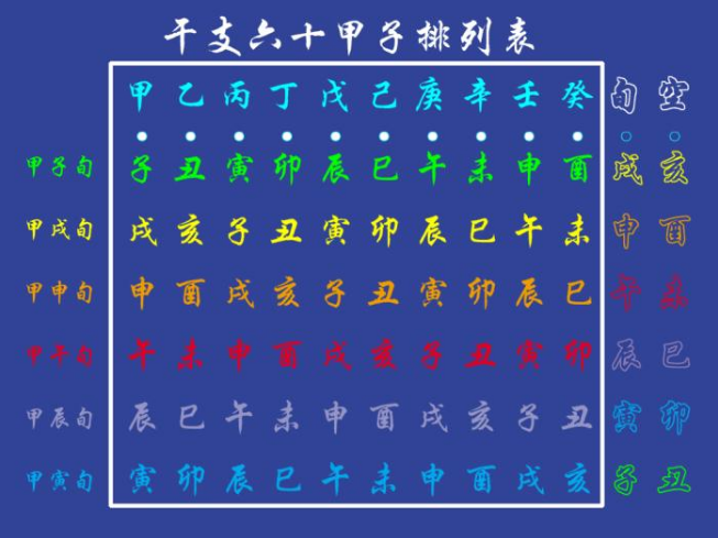 应用方法: 利用掌中旬诀得知干支为第几旬,找到本旬那句口诀,依次往后数。例如丙子:由掌中旬诀得知为六十甲子第二旬的甲戌旬,即口诀的第二句。丙为第二个字“涧”,亦即“涧下水”。