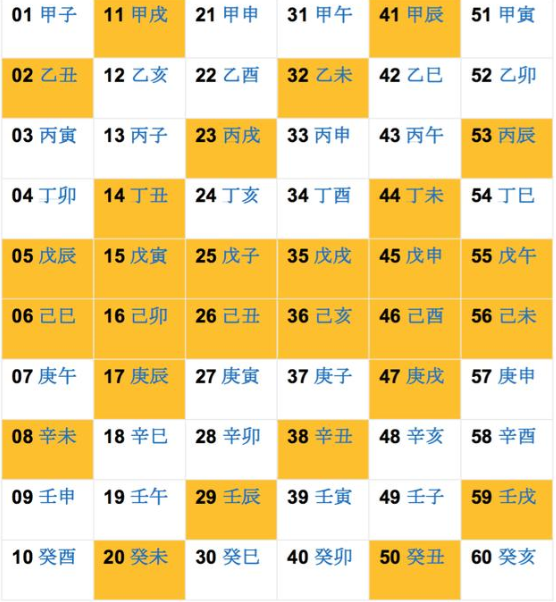 甲午乙未沙中金,丙申丁酉山下火,戊戌己亥平地木,庚子辛丑壁上土,壬寅癸卯金泊金。
