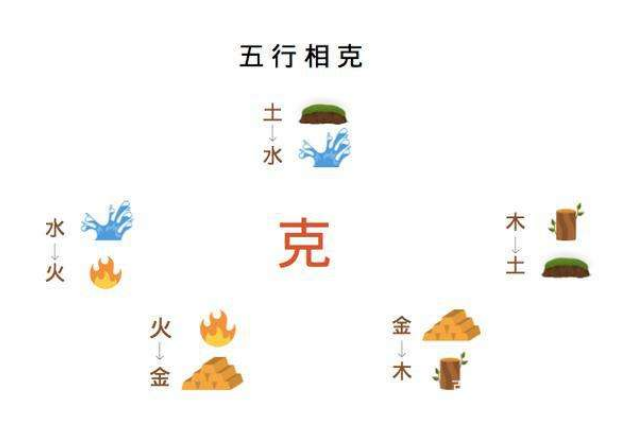 五行相克的次序是:木克土,土克水,水克火,火克金,金克木,木克土。这种克制关系也是往复无穷的。木得金敛,则木不过散;水得火伏,则火不过炎;土得木疏,则土不过湿;金得火温,则金不过收;水得土渗,则水不过润。皆气化自然之妙用。