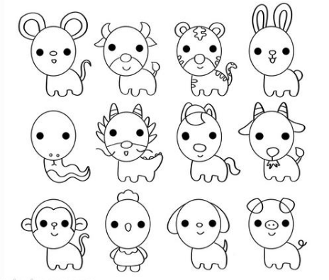 依次画出十二个生肖动物,注意画出每个动物的特征,然后就可以涂色了,给老鼠涂灰色,老虎涂黄色,兔子涂粉色,小羊涂上蓝色,小鸡涂黄色和红色,小猪涂粉色,超级可爱的十二生肖简笔画就画好啦!
